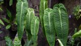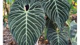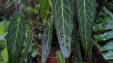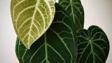 アンスリウム・クリスタリナムの最大の特徴は、その葉です。濃い緑色でビロードのような手触りがあり、ハート型をしています。さらに、葉には白く目立つ葉脈があり、とても美しい模様を作り出します。この姿は、同じアンスリウム属のアンスリウム・マグニフィカムに少し似ていますが、クリスタリナムの方がやや小ぶりです。